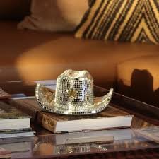 A disco cowboy hat is a stylish cowboy hat designed with glitter, metallic finishes, sequins, rhinestones, or LED lights inspired by disco fashion.